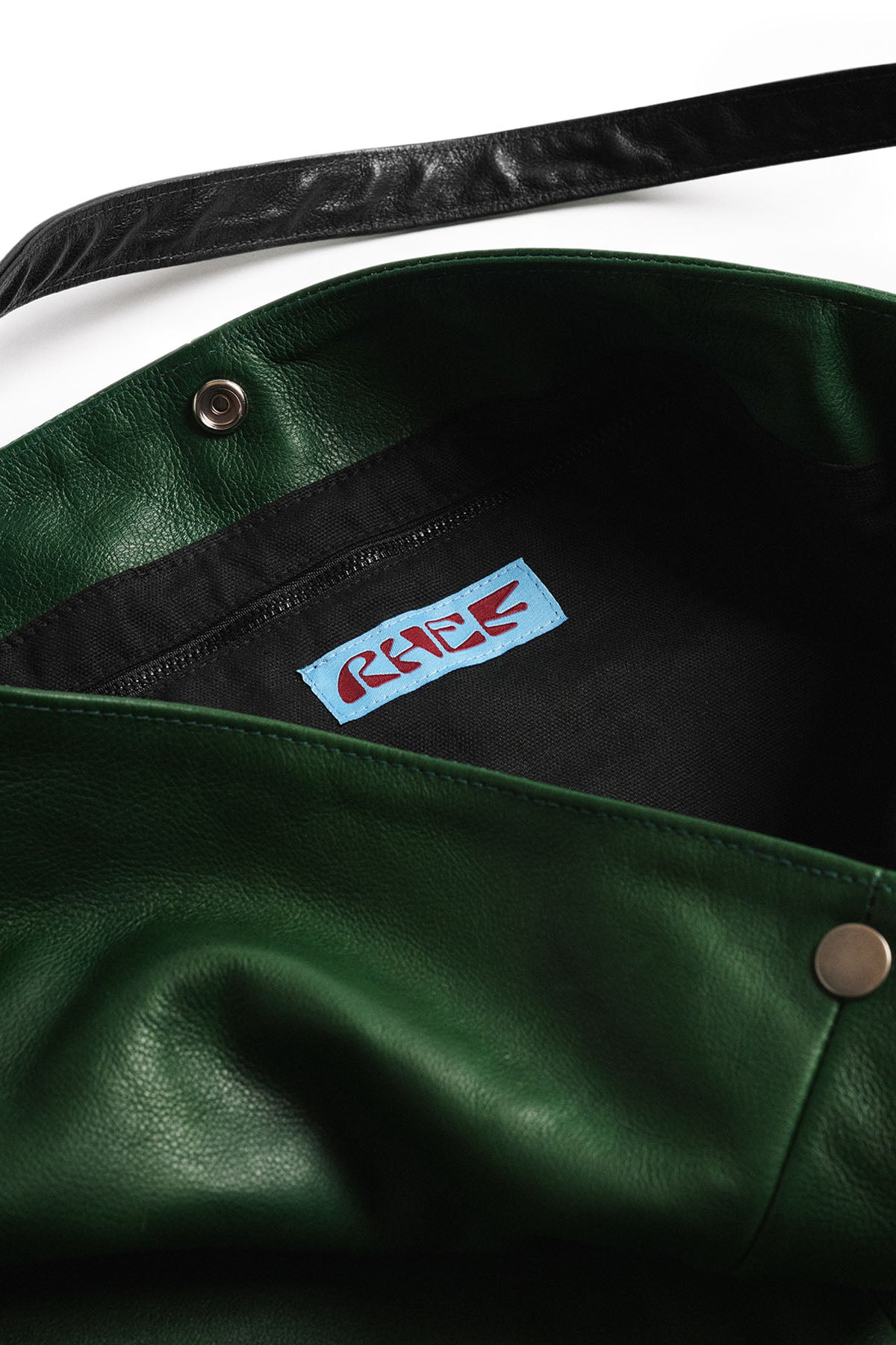 FEATURES INTERIOR POCKETS, ADJUSTABLE STRAP AND SNAP CLOSURE.